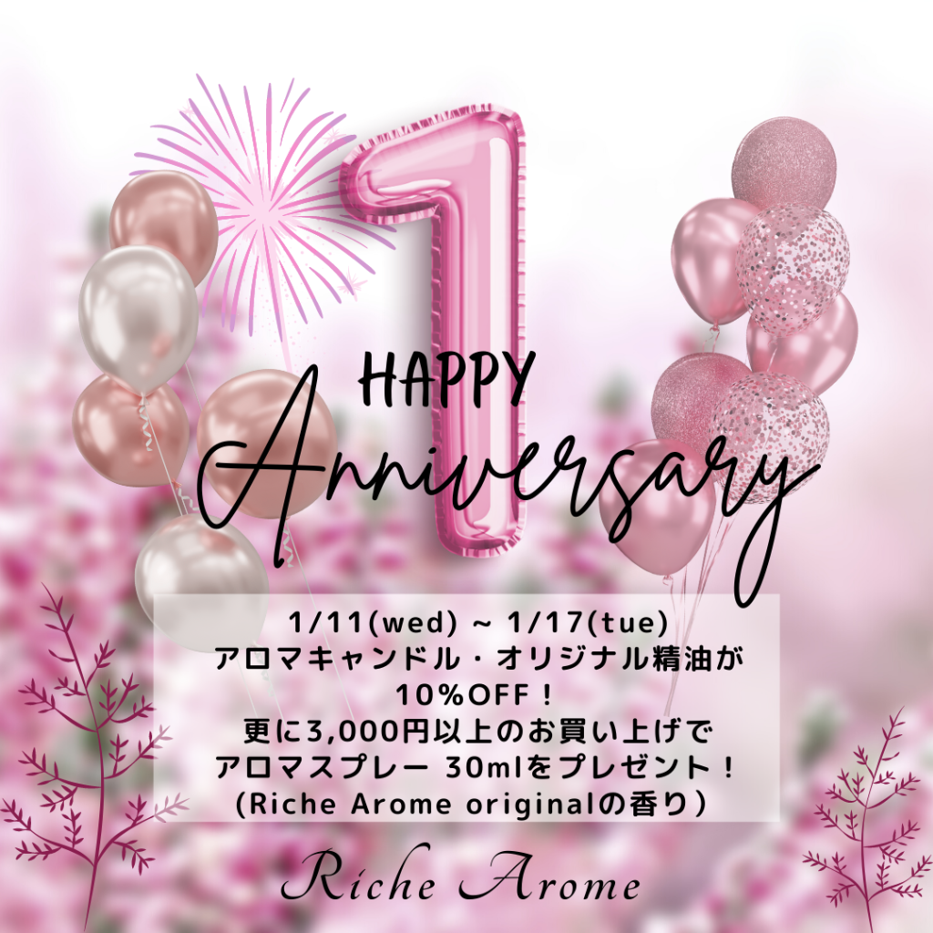 そして、そんな皆様への感謝を込めまして、1月11日〜1月17日まで💛一周年感謝祭💛と題しまして、アロマキャンドル・オリジナル精油を10%OFFと致します😄