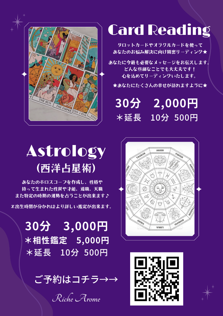 もぅ既にご利用頂いているお客様もいらっしゃいますが、イベントや、お声掛け頂いた方を中心に、現在タロットカードやオラクルカードを使ったカードリーディングや、西洋占星術鑑定をさせて頂いています🎵